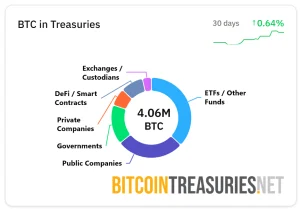 Como podemos ver en la figura anterior, las tesorerías junto a los fondos y a otras entidades (como gobiernos y hasta contratos inteligentes), suman un total de cuatro millones de BTC (4.060.000, para ser exactos), lo cual representa un 19.33%, es decir un quinto del suministro máximo de veintiún millones de monedas (BTC 21.000.000).