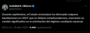 El Estado venezolano está dando un giro en su estrategia cambiaria, efectuando en septiembre más liquidaciones en la stablecoin Tether (USDT) que en dólares estadounidenses. Así lo reveló el economista y consultor Asdrúbal Oliveros, quien destacó el “cambio trascendental” que está ocurriendo en el mercado cambiario venezolano.